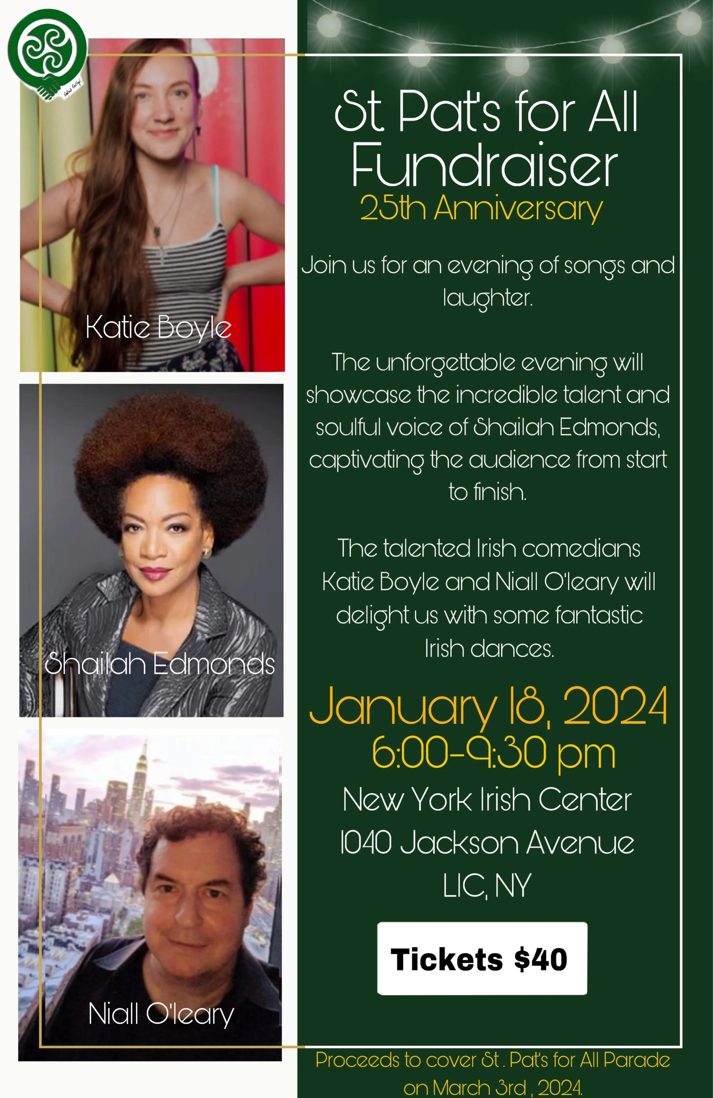 All are welcome to join St. Pat’s For All annual fundraiser, with performances by Shailah Edmonds, Comedian Katie Boyle, and Niall O’Leary’s Irish Dancers.