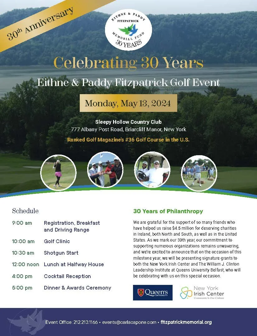 John Fitzpatrick and the Committee at the Eithne & Paddy Fitzpatrick Memorial Fund have selected the New York Irish Center as a signature beneficiary of their 30th Anniversary Memorial Golf Tournament, which is scheduled for Monday, May 13 and will be held at one of the most prestigious private golf courses in the country, Sleepy Hollow Country Club.